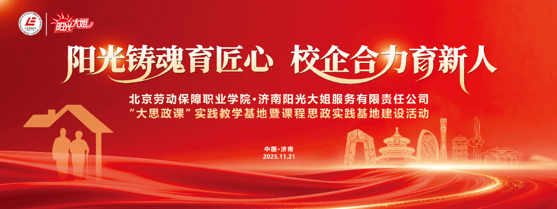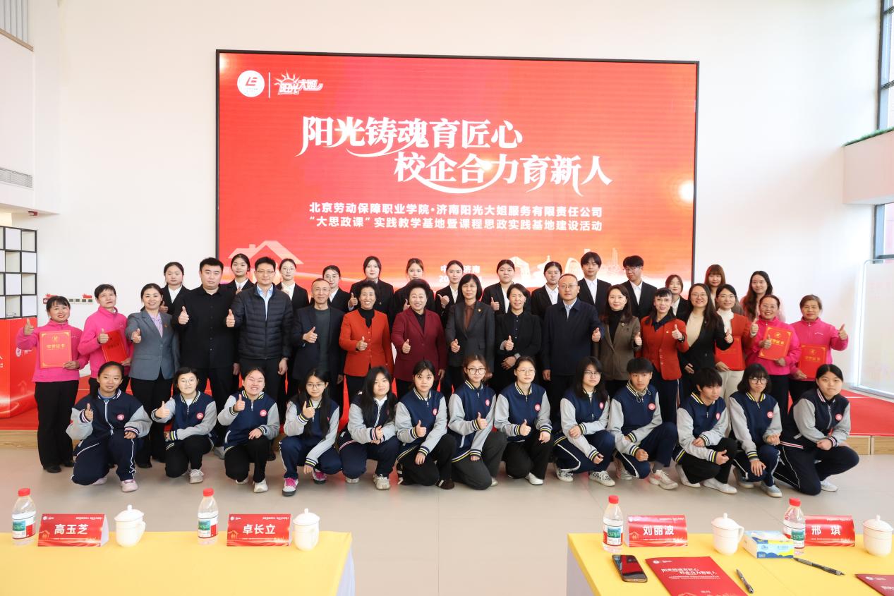 冬月泉城,阳光明媚。11月21日,北京劳动保障职业学院“大思政课”实践教学基地暨课程思政实践基地共建系列活动走进山东济南,与全国家政服务行业领军企业——阳光大姐集团隆重举行“大思政课”实践教学基地暨课程思政实践基地共建活动。这是继四季青敬老院之后,北京劳动保障职业学院在民生服务领域布局的又一重要育人阵地,标志着学校“大思政”育人体系建设迈出坚实的一步。